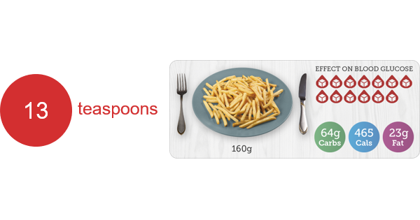 One meal can be the equivalent of over 18 teaspoons of sugar (each drop of blood with a sugar cube in is equivalent to a teaspoon of sugar in the pictures).