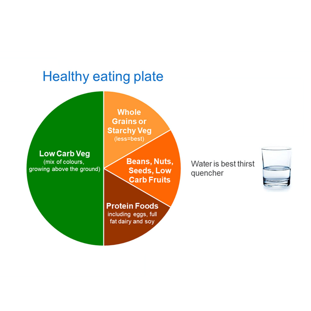 - Eat balanced meals using the healthy eating plate above. Ideal proportions are half a plate of vegetables growing above the ground, quarter a plate of protein (e.g. meat, fish, nuts, seeds, full-fat dairy), and less than a quarter plate of whole-grain carbohydrate.
