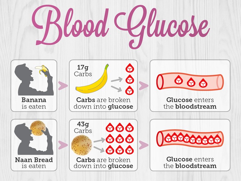Sweet and starchy carbohydrates in food and drinks breakdown into glucose and can increase your blood sugar level.